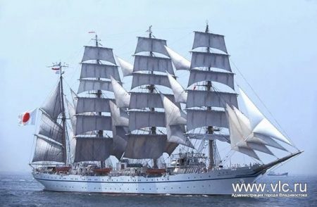 Справка. Четырехмачтовый барк «Kaiwo Maru» является учебным судном для курсантов морских учебных заведений Японии с 1989 года. Его длина 110,7 метров, ширина 13,8 метров, осадка 10,7 метров, крейсерская скорость – 12,9 морских узлов. Парусное «вооружение» судна «Kaiwo Maru» состоит из 36 больших парусов, которые поднимаются и складываются благодаря современной системе автоматики.
