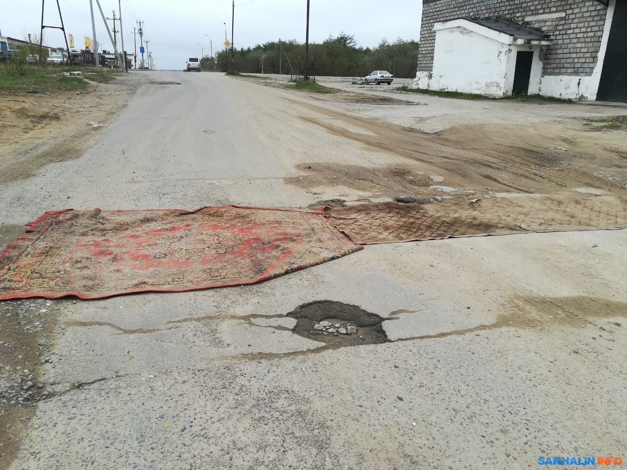 Коврами закрыли ямы на дорогах сахалинской Охи горожане, устав от бездействия властей