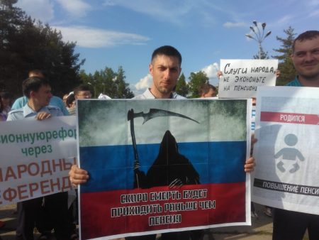 «Пенсионная реформа — позор государства!», «Повышайте качество жизни, а не пенсионный возраст!», «Мы пахали, мы пахали, ждать мы пенсии устали. Мы немного отдохнем, если только доживем!» — под такими лозунгами стояли на привокзальной площади владивостокцы.