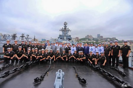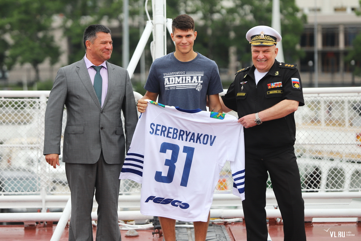 В этот раз вручение игровой формы проходило на флагмане ТОФ России. Футболки хоккеистам вручали командующий Тихоокеанским флотом адмирал Сергей Авакянц, а также врио губернатора Приморского края Андрей Тарасенко.