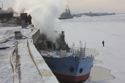 В 15.10 (хбр) прибывший первый пожарный расчет обнаружил открытое горение на двух пришвартованных неиспользуемых суднах. Огнём было охвачено машинное отделение одной из барж на площади 60 кв.м., также воздействию пламени подверглась обшивка соседнего судна площадью 15 кв.м. Тушение осложнялось наличием в трюмах остатков дизельного топлива. Чтобы эффективно организовать работы по тушению, пожарные приняли решение провести пенную атаку. Во время разведки огнеборцами были обнаружены и вынесены на открытый воздух около десяти кислородных баллонов.