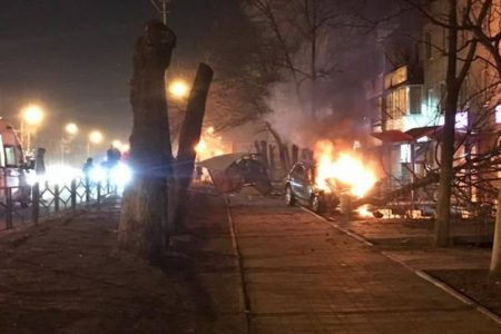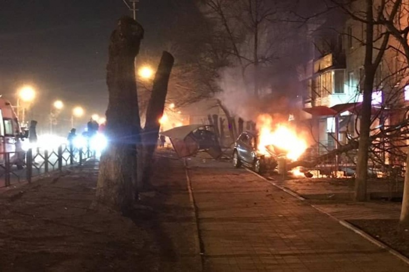 Конструкция остановки общественного транспорта «Комсомольская» после столкновения оказалась на тротуаре для пешеходов. Завершился «полет» Nissan Murano ударом в дерево, после которого машина загорелась.