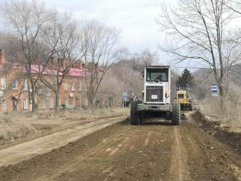 Во Владивостоке на Русском острове грейдируют дорогу и нарезают кюветы
