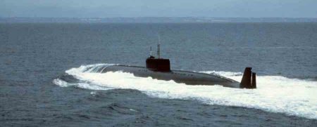 A port quarter view of a Soviet Papa class nuclear-powered cruise missile submarine (SSGN) underway.