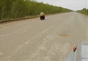 Медведь с бидоном на голове ходит по дороге на Камчатке с явной надеждой на помощь людей: иначе его ждет гибель