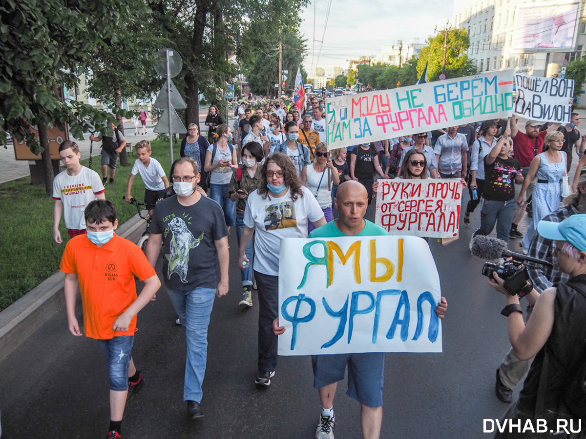 Скандирующие вновь прошли по протестному квадрату через все центральные улицы. Но в этот раз люди скандировали не только хорошо знакомые лозунги: «Наш край — наш Фургал», «Я, мы, он, она — за Фургала вся страна», «Верните нам Фургала», «Москва, уходи!», «Фургал наш выбор!». Добавились к этому и новые: «Хабаровск, выходи», «Позор Жириновскому», «Позор ЛДПР», «Жириновский предатель и лгун!», «Дегтярева домой!». Обновились и плакаты – в первых рядах стояли девушки с баннером «На чужой край — рот не разевай, в космос улетай».