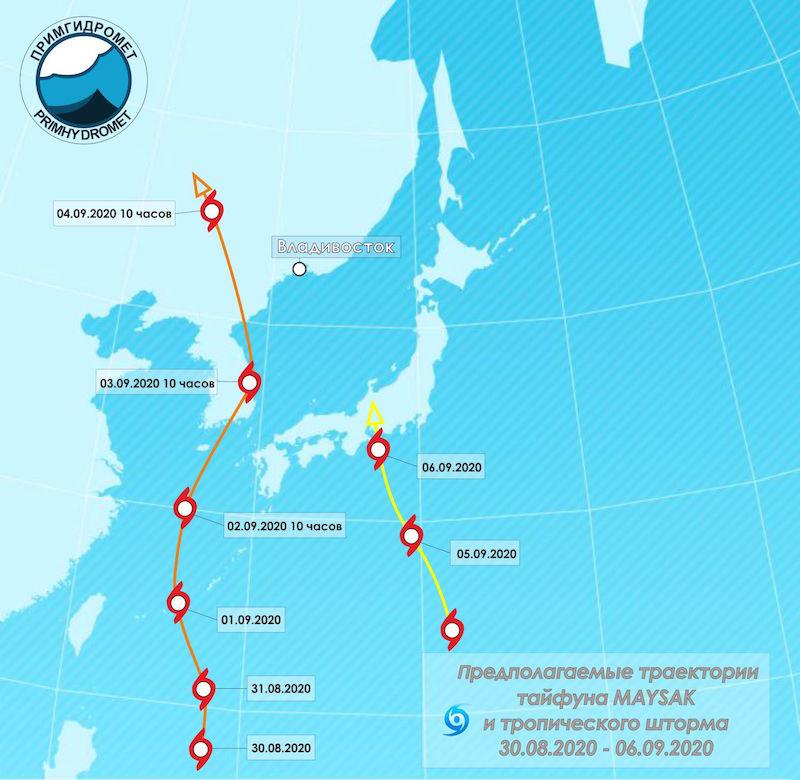 . Озвученная ранее синоптиками Примгидромета траектория вихря существенно не меняется. В среду, 2 сентября, он ударит по японскому острову Окинава, затем выйдет в Восточно-Китайское море. Далее тайфун начнет смещаться в северо-восточном направлении и в четверг ночью окажется над югом Корейского полуострова, принеся с собой обильные дожди и штормовой ветер. Днем 3 сентября тайфун пройдет над полуостровом, а далее на северо-восток путь ему преградит гребень антициклона. В результате этого в пятницу, 4 сентября, ночью вихрь повернет на северо-запад и выйдет на территорию Китая. На погоду Приморского края тайфун окажет косвенное влияние, в основном, на юго-западные и западные районы.