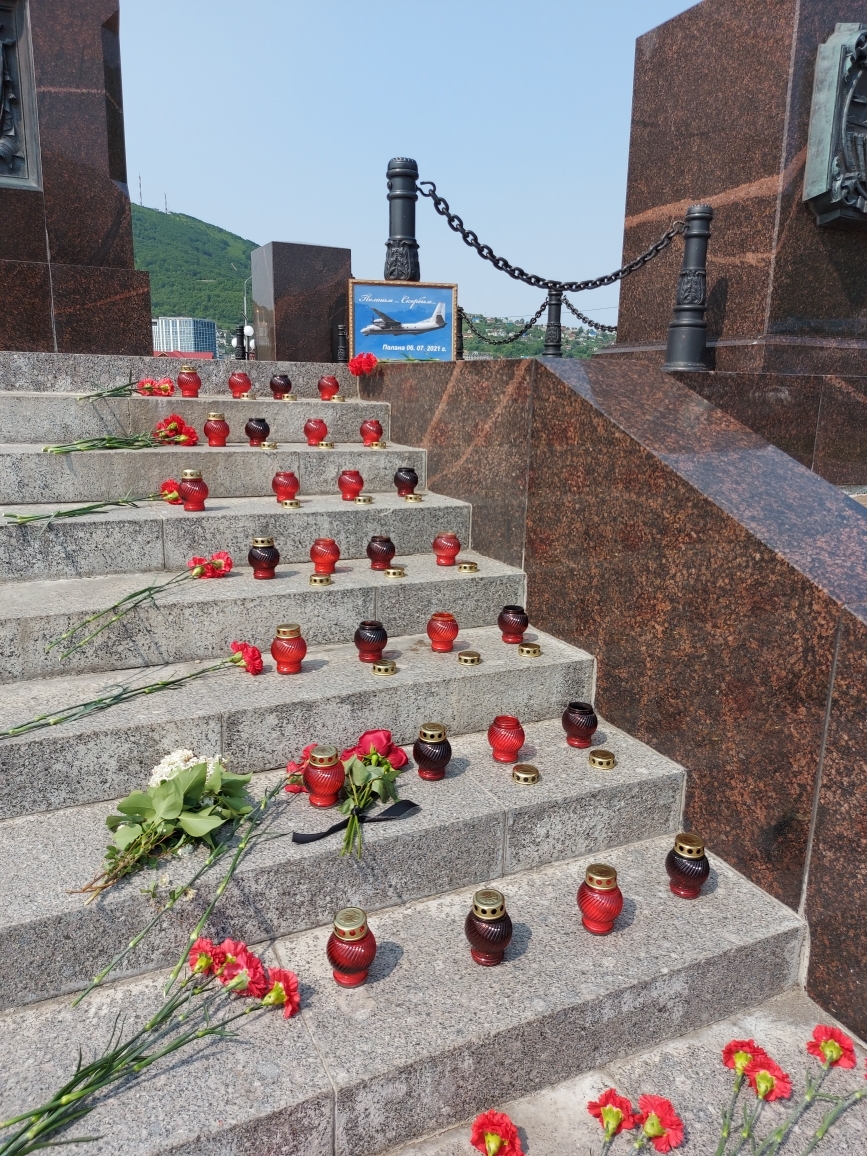 Стихийный мемориал образовался на ступенях стелы «Город воинской славы» в центре Петропавловска-Камчатского.