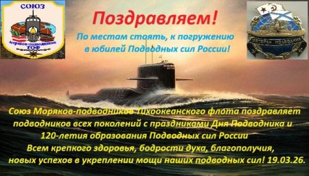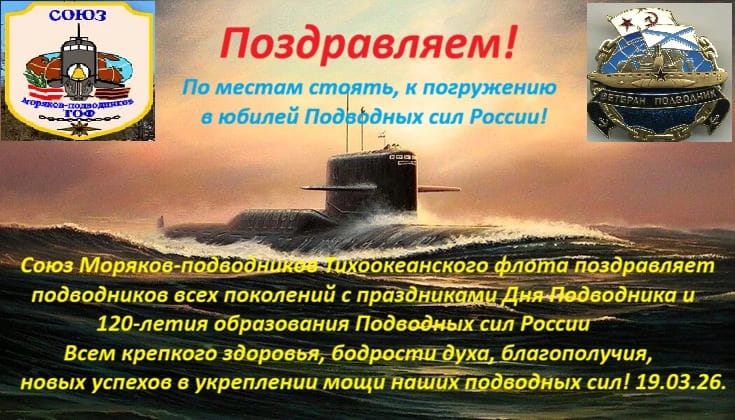 Всем крепкого здоровья, бодрости духа, благополучия, новых успехов в укреплении мощи наших подводных сил! 19.03.26.