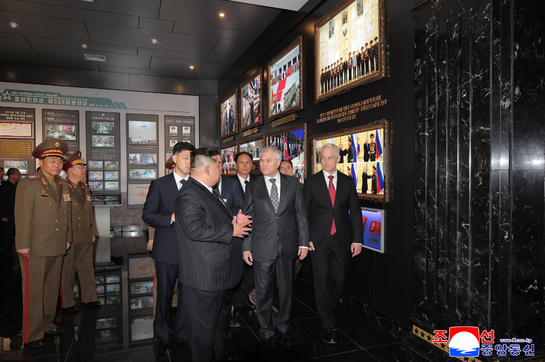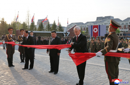Министр обороны КНДР Но Гван Чхор и министр обороны РФ Андрей Белоусов разрезали красную ленту в честь открытия музея.