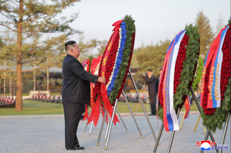 Товарищ Ким Чен Ын возложил цветок к стене памяти с изображением павших борцов – бессмертных звезд, которые с присущей КНА верностью партии и Родине, пламенным патриотизмом и массовым героизмом продемонстрировали великое имя сильных и славу победителей, затем выразил почтение.