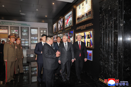 Товарищ Ким Чен Ын вместе с ведущими членами официальной делегации РФ, руководящими кадрами партии, правительства и ведомств вооруженных сил осмотрел Мемориальный музей боевых подвигов в зарубежной военной операции.